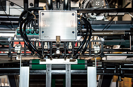 本機(jī)可根據(jù)紙張的尺寸,調(diào)整主機(jī)與給紙系統(tǒng)的轉(zhuǎn)速差,使主機(jī)在盡量低速的運(yùn)轉(zhuǎn)狀況下完成紙張貼合。在關(guān)于面紙的超前量控制方面,該機(jī)更是可以方便地通過(guò)人機(jī)界面輸入所需要的面紙超前數(shù)據(jù)即可完成調(diào)整工作,而不需要傳統(tǒng)繁雜的機(jī)械操作。