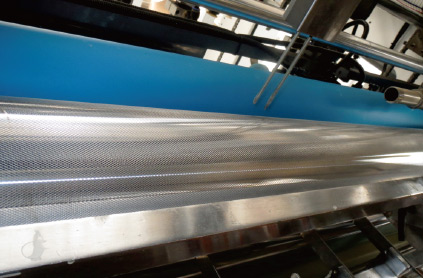 該涂膠部分,采用特有工藝之網(wǎng)紋輥,使整機(jī)涂膠均勻,并且與傳統(tǒng)工藝之網(wǎng)紋輥相比較,每平米涂膠量可降低約5克。